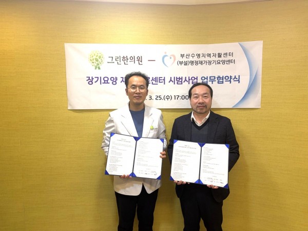 부산수영지역자활센터 (부설)명정재가장기요양센터(센터장 최치훈)와 그린한의원(원장 배준상)은 장기요양 수급자의 건강관리 강화와 지역사회 통합돌봄 실현을 위해 지난 25일 업무협약(MOU)을 체결했다고 밝혔다.